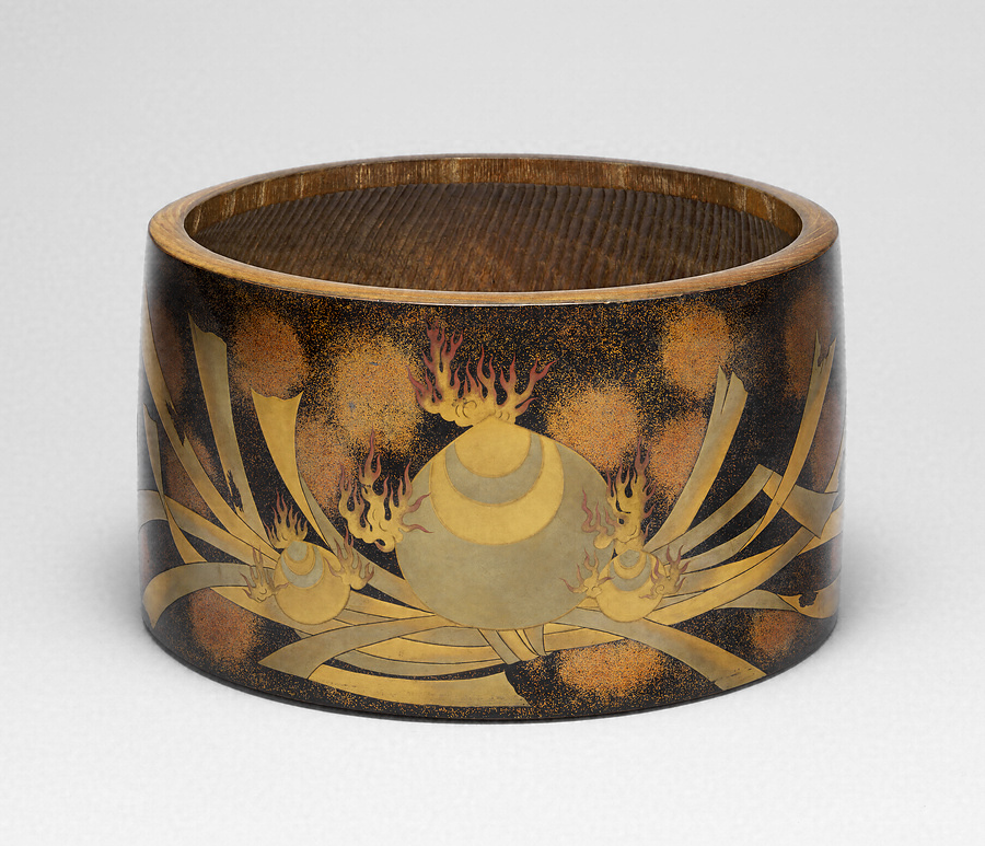 欅の挽物で内側に麦藁カンナがある太鼓胴である。外側は玉梨子地に金粉と青金粉の高蒔絵で、束ね熨斗の上の3つの火焔宝珠を表したもので、ほぼ同趣の模様を前後両側に施したものである。革・掛台・外箱が附属し、GK21~23で一具となる。