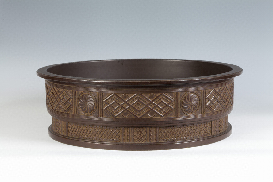 高岡出身の図案家・米田鳩秀の下図を元にして、鳩秀の弟で鋳造家の鷲塚暁珉が製作した高岡銅器の青銅一文字型水盤である。