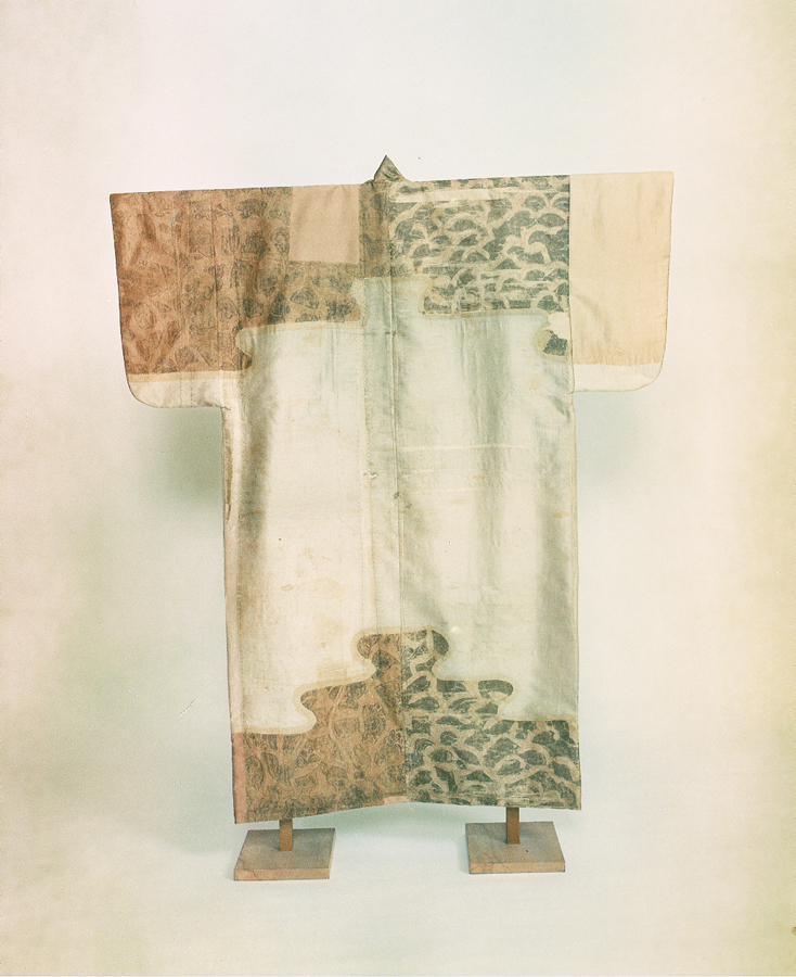 黒川能(重要無形民俗文化財)の上座大夫家に伝来した装束で、大夫世襲披露の際に舞われる翁舞いに着用された狩衣である。表には黄緞【おうどん】を用い、裏には白練緯【ねりぬき】地辻が花染小袖を引き解き裏返しに付けて袷仕立てにしている。黄緞は経に絹糸、緯に木綿糸を用いた繻子組織の織物で、中国・明時代にはかなり製織され、わが国にも舶載された。室町から桃山時代の能装束のうちには黄緞を用いた狩衣や法被などが散見されるが、なかでもこの黄緞は堂々たる蜀江文様が織り出され、明時代も盛期のものと考えられる。また裏地の小袖裂はほぼ一領分が用いられ、当初は肩と裾を紅の洲浜形に染分け、朱描きと金銀摺箔【すりはく】で草花貝藻文様を片身替に表した辻が花染の肩裾小袖であったことがわかる。狩衣の形状は小振りな仕立てで、総体に古様を伝えている。現存する能装束の中でも室町時代にまで遡る古例であり、同時に裏地の辻が花染小袖裂も類例の少ない室町時代の小袖資料として貴重である。