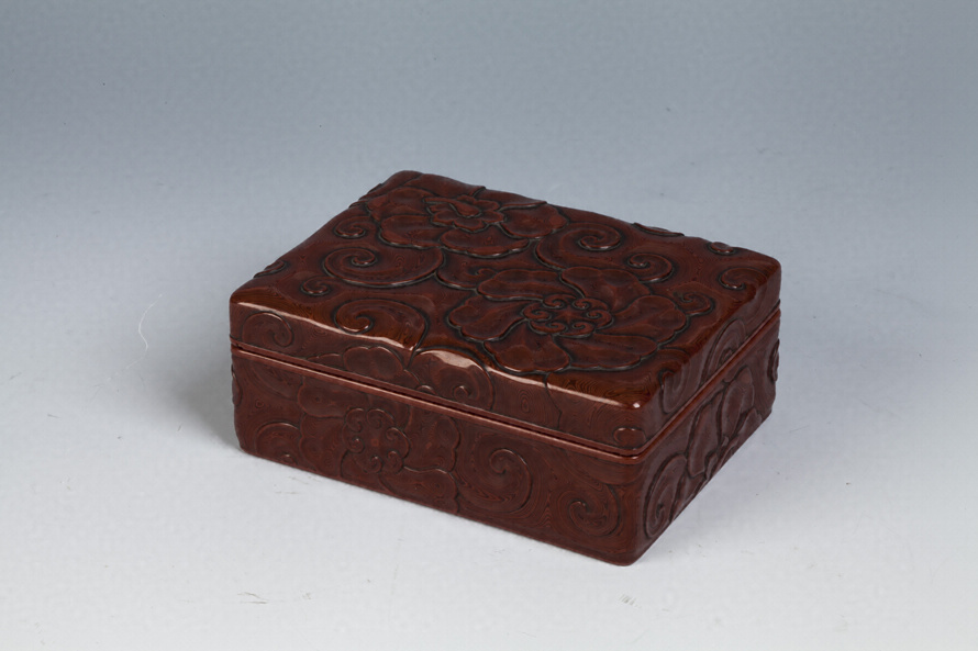 石井勇吉(二代勇助)作の、花の文様が堆朱で表現された勇助塗の小箱である。文様は蓋と身の表側全面に施されている。