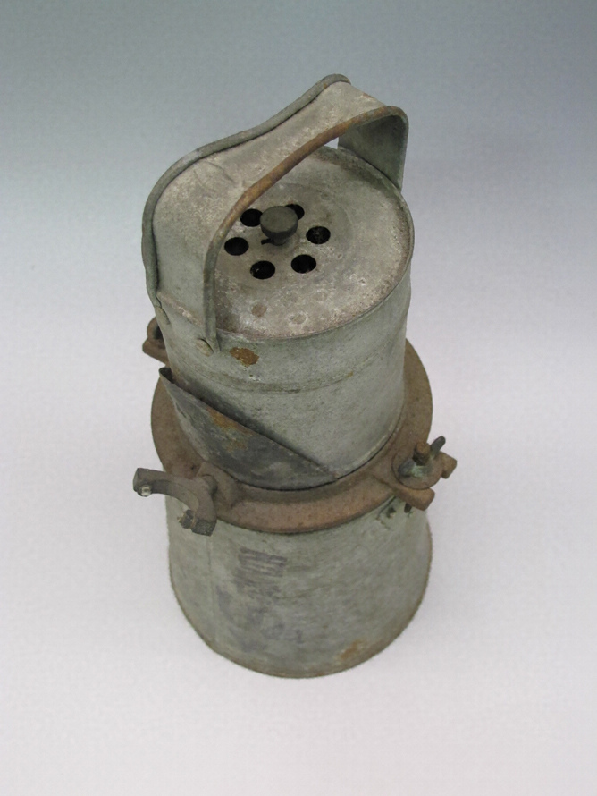 カーバイド(炭化カルシウム)を下筒に入れ、上筒に水を入れる。上筒から落ちた水滴が下筒に入ったカーバイドに反応して発生するアセチレンガスを燃料として使用するランプ。