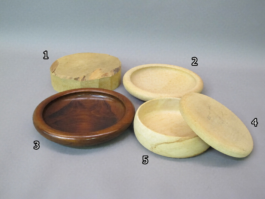 【1】は木取り後の物、【2】・【4】・【5】は仕上げ後の物、【3】は拭漆塗後の物である。
