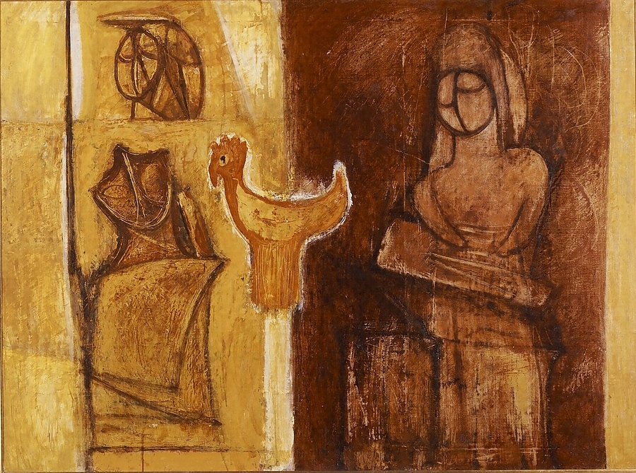 黄色と茶色で二つに分けられた画面の中に、人や鳥の形をした埴輪たちが古代の琴の音色に集うように描かれている。褐色のみで全体をまとめ、引っかいた線により埴輪の乾いた素朴な感じを表現している。シャープで洗練された構図の中にも、色調や質感にはどこか温かみが感じられ、古代への郷愁を誘う。古い壺がもつ深い味わいに惹かれて早くから絵のモチーフにしていた作者は、初渡欧からの帰国後、埴輪に強い興味を持つようになる。異国に身を置いたことで、それまでフランスの近代画家に強い影響を受けた制作から脱し、日本人としての民族性を意識するようになっていた。近代化が進み、機械文明が浸透する中で、古代の遺物に見られる素朴さや力強さが現代人に訴え、岡本太郎などによる縄文土器を美術品として捉えるような時代背景も作者の目を埴輪に向わせたのかもしれない。