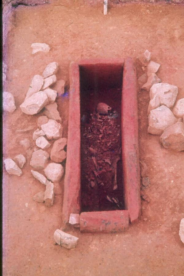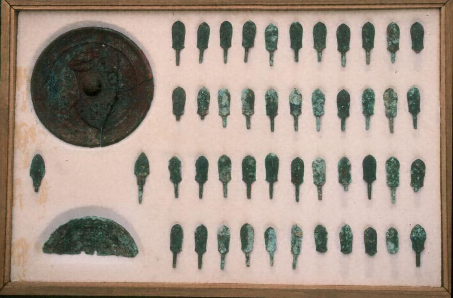 出土品としては、東棺内で人骨と神人竜虎画像鏡、管玉2、棺外からは鉄剣1、刀子2、鉄鎌1などがあり、西棺の棺内には内行花文鏡片1、棺外には銅鏃47、鍬先1、鎌1、斧2、鉋2、その他鉄製品若干、土師器壺2がみられる。内行花文鏡は破砕後磨研され、2孔がうがたれている。両棺の間に鉄剣の破片がある。
