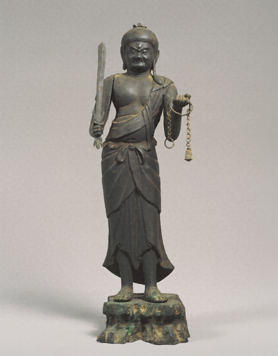 頭部を小さく作り、極めて長身にあらわされる。体部の肉付けも柔らかで、平安後期の作風を示すものであるが、実際の制作期は鎌倉期に入っているかもしれない。像の根幹部分を一鋳から造り出し、像内は腰下に開けられた大きな長方形の窓から中型土(なかごつち)を取り出している。両手は各々別鋳され、アリほぞにて肩口で接合される。持物・背面腰下の扉等は後補。