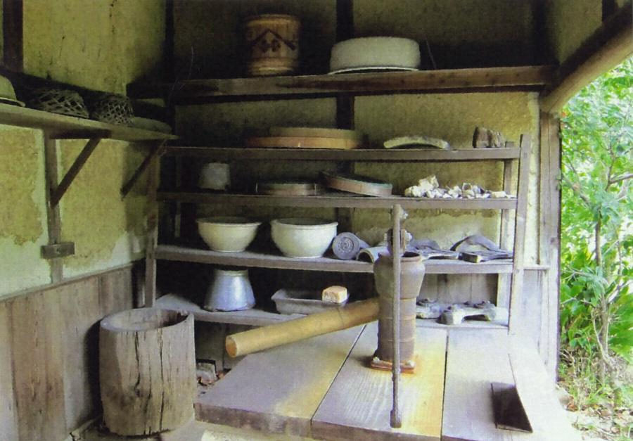 主屋の南東方向、台所の傍らに建ち、外台所とも呼ばれていたという。建ちが低く、屋根は招造桟瓦葺とする。平面は、西から井戸、土間、床上部とし、それぞれ土壁で仕切られる。中央の土間にはかつて竈が設置されていた。往時の生活の様子を現在に伝える施設。