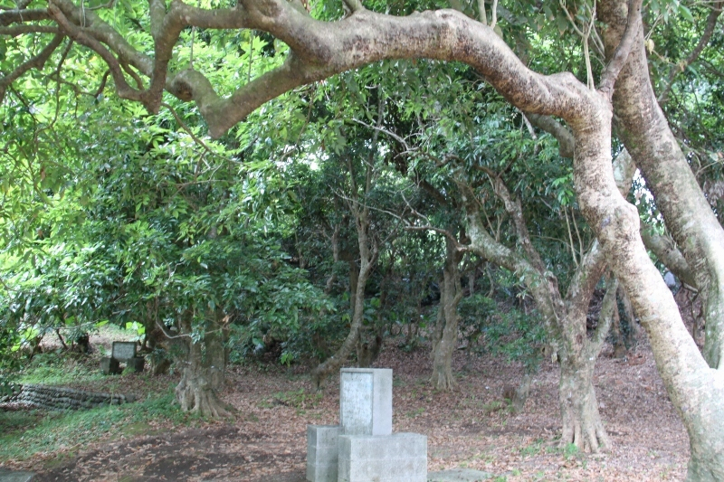伊坐敷部落ノ西南字堀切及字上ノ園平ノ二箇所ニアリ 藥園ハ貞享四年新納時升ノ藩主ニ獻上セル龍眼樹ヲ此地ニ植エタルニ起因シ寶暦明和ノ頃更ニ藥草木ヲ栽培セシモノニシテ明治維新迄番人ヲ置キ之ヲ管理セシメタリ 字堀切ノ藥園ハ面積約八百坪西北ニ丘陵ヲ負ヒ其東南麓及東部平坦地ニ龍眼樹ヲ栽培セルモノニシテ現今二十八株アリ 毎年果實ヲ採取セリ他ニ茘枝、和殻、アカテツ、印度護謨樹等アリ園内ニ番人住宅、小屋等今猶存ス 字上ノ園平ノ藥園ハ堀切ノ分園ニシテ舊時ノ面積詳ナラス現今龍眼樹三株アリ 熱帶植物ヲ栽培セル藥園トシテ著名ナリ
