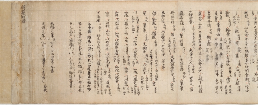 「教訓抄」(十巻)は鎌倉時代狛近真【こまのちかざね】が著わしたわが国最古の舞楽書。楽曲や楽器の由来・奏法・逸話などを蒐録してあり、雅楽研究上重要な典籍となっている。本巻は巻第十の打物案譜法を書写したもので、大鼓・鉦鼓・楷鼓などの譜や奏法・口伝等が記されている。書写年代は鎌倉後期の文保元年(一三一七)で、筆者の豊原兼秋は後醍醐天皇の笙師であった。紙背には豊原家相伝の荒序舞の古記録二種の抄記や応永元年豊原量秋【かずあき】追記の当道相伝事などがある。雅楽書の古写本として注目されるものである。