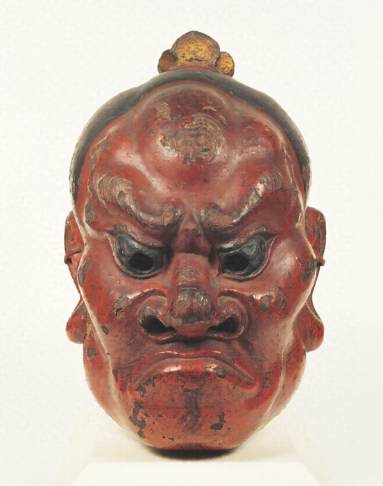 遺品の僅少な鎌倉時代初期の伎楽面で、南都の有力仏師の作とみられる。眉を吊り上げて眼を見開き、目じりの上に松葉状に分かれる血管を表現する。古代の力士面は歯列を表現するが、本品は口を「へ」の字に結び、歯列をあらわさない。この形式は同時代の金剛力士の吽形像(うんぎょうぞう)の姿に基づくと考えられ、東大寺南大門像などにも通ずる特徴がうかがえる。忿怒相(ふんぬそう)の表現に仮面特有の意匠化のあとはみられるが、弾力感に富んだ筋肉の隆起を的確に描写した現実感に富む作風も、諧謔味(かいぎゃくみ)の顕著な古代の力士面とは一線を画している。キリ材製。