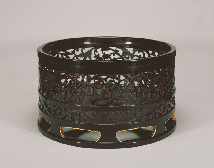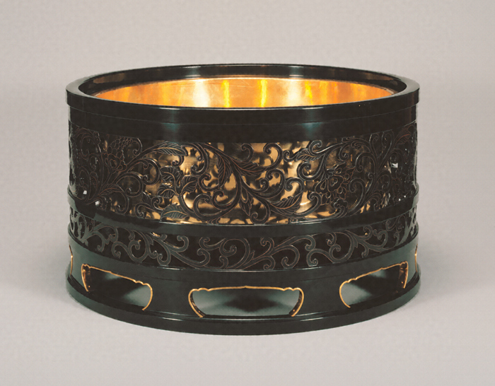 本体:木製黒漆塗 金蒔絵 内容器:銅打出製 鍍金