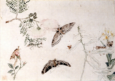 賀来飛霞動植物写生図 ねむの木に蛾・カマキリ・バッタ図