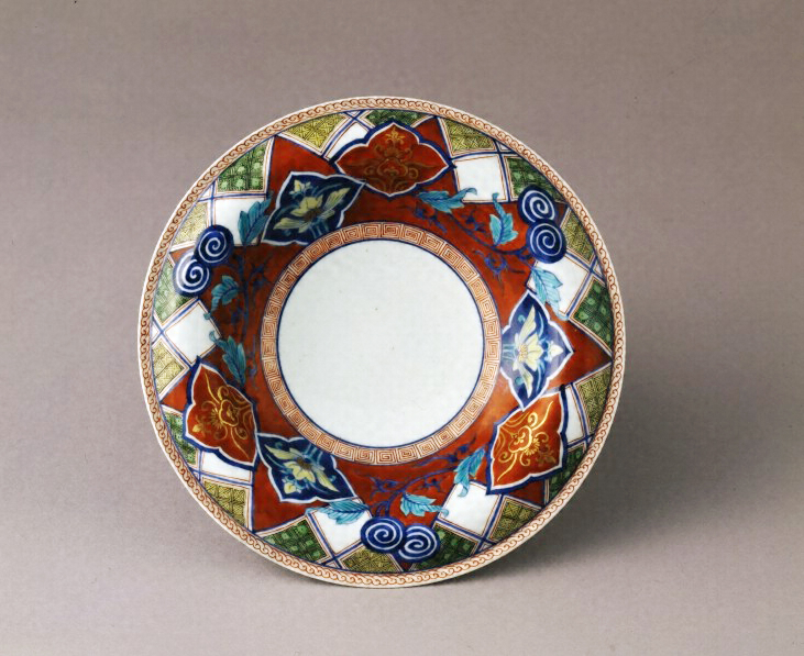 元禄頃の古伊万里型物と呼ばれる色絵磁器で、口辺が大きく外反する類例少ない器形をなす。染付と赤・緑・器・青緑・黒の上絵具による賦彩に金彩を加えた文様が的確に描かれ、清明な色調を呈する。