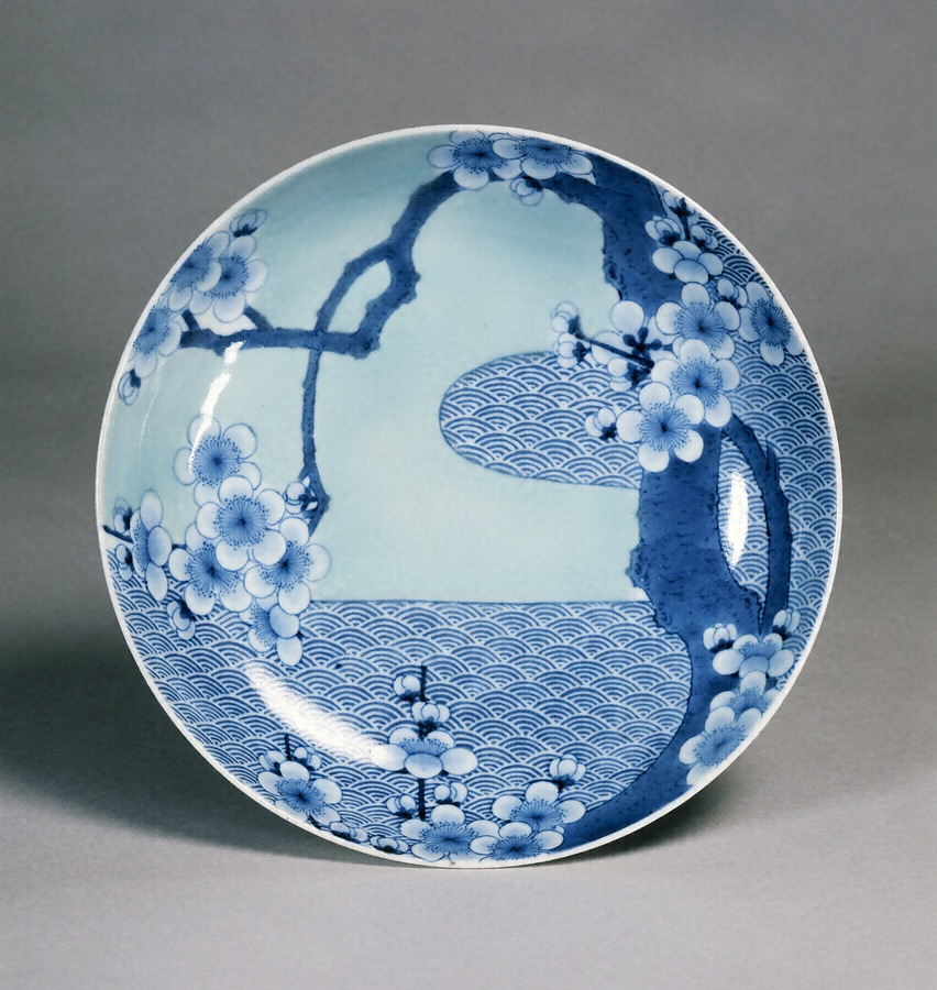 染付と青磁を組み合わせた青磁染付の七寸皿で、器形は典型的な木盃形をなす。見込の文様は梅樹と青海波文を染付で見事に描く。