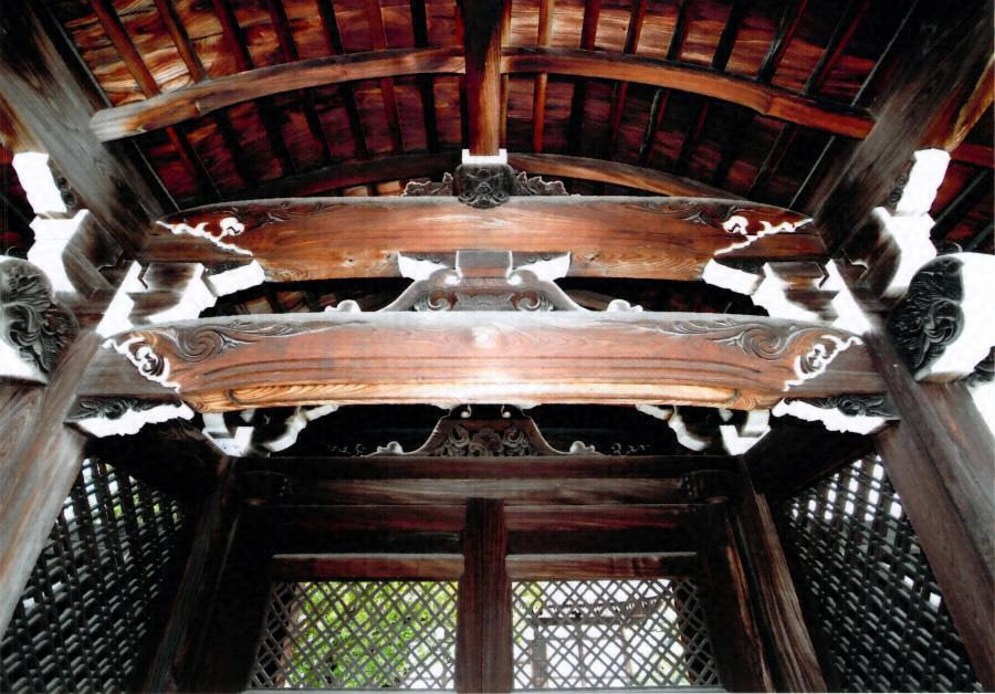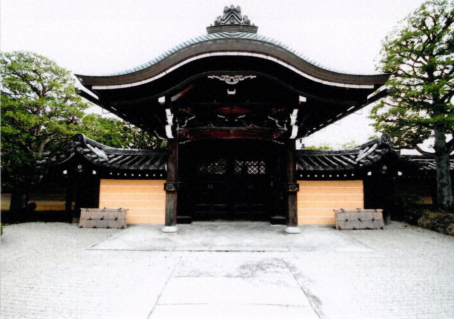 大方丈の南正面、上面四半敷とした切石積基壇に建つ。四脚門形式で、丸柱と面取角柱を長押と頭貫で固め、屋根は向唐破風造の銅板葺、軒は二軒疎垂木で木舞打とする。扉と壁にある繊細な吹寄菱欄間、濃密な絵様繰形細部など、昭和初期の造形が凝縮されている。