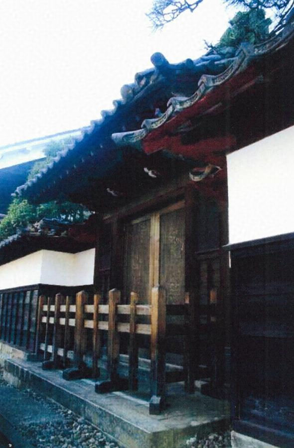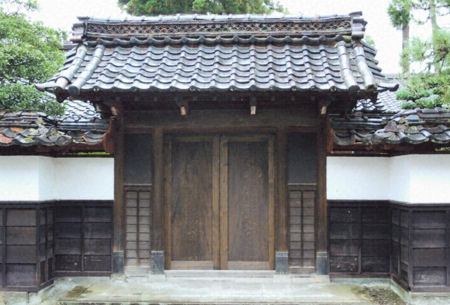 離れ南庭を挟み、通りに面して建つ。間口2.7mの腕木門。中央1.6mを門口として、両開板戸を吊り、両脇に腰板張の黒漆喰とする袖壁を造る。切妻造桟瓦葺。軒桁と冠木間に軒天井を張り、疎垂木を配る。基礎の笏谷石、黒壁、木部の弁柄の対比が印象的。