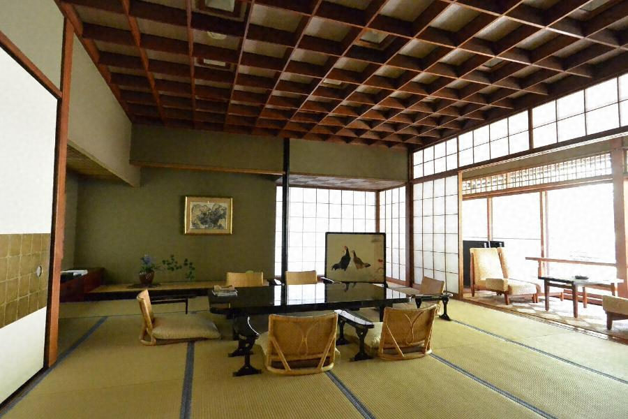 客室から庭への目線が交差せぬよう配置計画された客室棟。吹抜けのロビーに橋を架け、天井に四季の花を描き、廊下はガラスブロック壁で採光する。各室は数寄屋を基調とし、伝統意匠と現代技法を巧みに融合させる。細部にも設計者平田雅哉の作風が窺える優品。