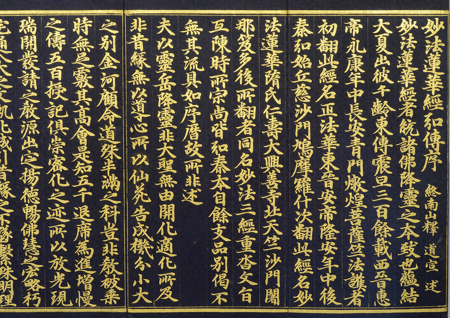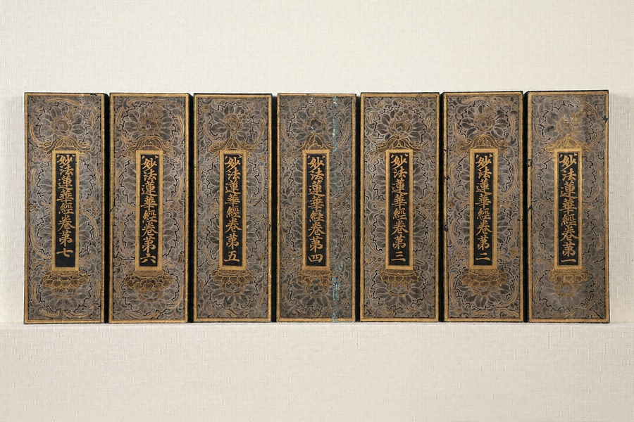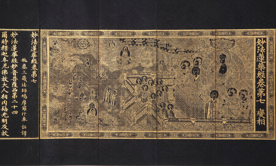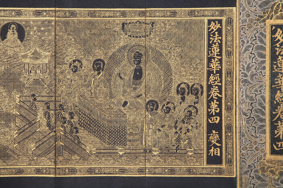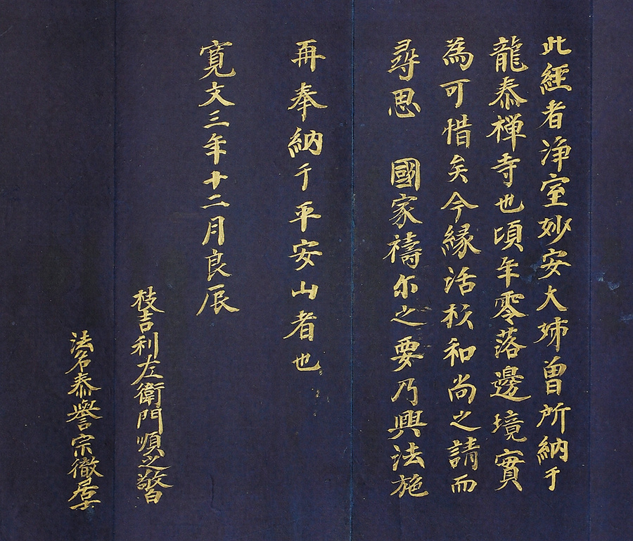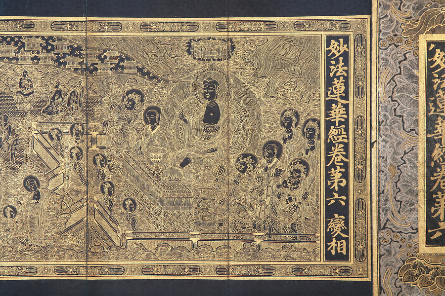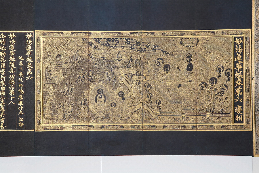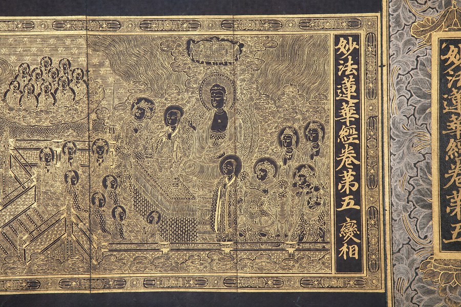 表紙には金銀泥で宝相華唐草文を、見返しには金泥で変相図(釈迦説法図)を描く。巻第七の奥書から沙門淵鑑の発願により施主劉成吉・朱暉・朴中漸と幹事戒禅・師・克倫の助力により、柏巖と聡古が書写したことが分かる。各巻巻末に別筆で正平12年(1357)、少弐頼尚の太宰府天満宮への寄進銘が記され、完成から17年後の南北朝時代に日本に請来されたことが分かる。さらに巻第七の施入銘により、寄進の後、尼僧妙安(みょうあん)により龍造寺家の菩提寺である佐賀の龍泰寺に収められたことが分かる。保存状態がよく全七巻が完存し、金の発色も素晴らしいなど高麗経の中でも随一のものである。
