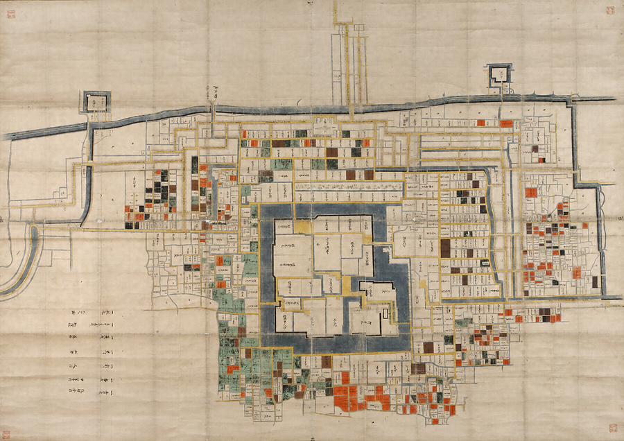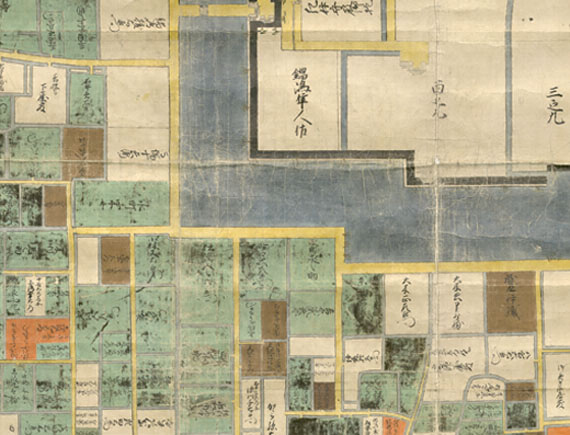 本図が製作された承応3年(1654)は、慶安2年(1649)の製作からわずか5年後にあたり、製作スパンが極めて短い。従って慶安期の絵図と比較したとき、同じ屋敷地に居住し続けている藩士も少なくない。しかし、いわゆる片田江七小路では、小路境の水路や屋敷地の間に細い水路が多数新設されている点など、わずか5年間で行われた城下づくりの様子を具体的にうかがうことができる。また町人地についても、本図は各町の長さや竈数(世帯数)、隣接する町との境界線などを詳しく記す唯一の絵図であり、この5年間で町人地が再編成されたことも分かる。慶長期に城下建設が始まって約半世紀を経た時期に、なお地割の変更、町名の変更などといった城下づくりが進行しているのである。