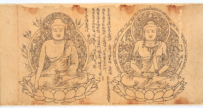 智証大師円珍(ちしょうだいしえんちん)(814~891)は、唐から一千余巻に上る多数の聖教類を請来した。請来目録に「胎藏諸尊樣一巻」とあるのがこの胎蔵図像を指すものと見られる。円珍は大中9年(855)に長安青龍寺において胎蔵灌頂を受けており、その後自ら胎蔵界の図を描いたと記録にあるのが注意される。上巻巻頭には「大毘盧遮那成佛神變加持經中譯出大悲胎藏生秘密曼荼羅主畫像圖巻一[分爲上下/今此上巻]」、巻尾には「珍自分之 爲上下巻」とあり、当本の具名と請来の後円珍自身により二巻に分巻されたことがわかる。