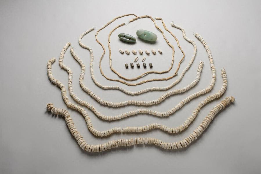 特に墓坑から出土した遺物は、多量の貝平玉、硬玉大珠、貝装身具など、その内容は非常に多彩であり、遺体に装着ないしは副葬された状態で出土した資料も多い。また、貝装身具の中には、本州南半以遠の地域に棲息するイモガイ・タカラガイ・マクラガイなどを素材にしたものがあり、糸魚川(いといがわ)産の硬玉、骨角器に付着したアスファルトなどは、日本海をめぐる遠方との交易を物語る。また作業場跡からは、石錐・敲石・短冊形石器・砥石など、平玉製作のための工具と考えられるものも出土した。