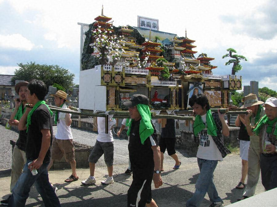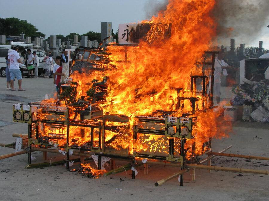 そして,15日昼を過ぎると,再び親類縁者が初盆を迎える家に参集し,据え燈籠を担いで墓地まで運び解体して燃やす。