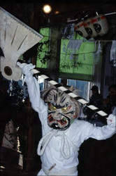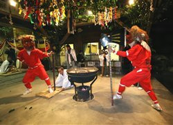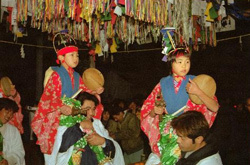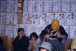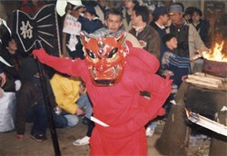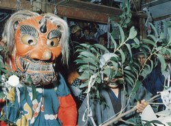 愛知県北設楽郡一帯で、十二月から一月にかけて毎年行なわれる湯立神楽の一種である。現在は同郡内で十七か所にわたって伝承されており、それぞれ部落によって多少ことなる芸態をとっているが、湯釜を据えた舞処【まいと】のまわりで湯立、湯潔めの舞、各種の面をつけた舞などが、夜を徹して熱気を帯びて演じられる点は共通している。花祭の花は、稲の花の意でその成熟を祈る花育ての意味から出たものとされている。神事芸能としての湯潔めの舞はすがすがしく古風なものであり、神賑いとしての面形も猿楽や田楽をしのばせ、芸能史的に重要。