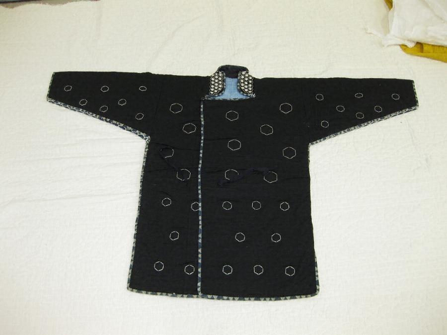 表地に黒羅背板、裏地に藍染めの麻地を用い、間に亀甲形の鉄の板金と鎖を藍染めの麻布に縫い付けて挟み込んでいる。縁に菖蒲韋の覆輪をめぐらす。袖を筒袖とし、立襟には亀甲金物を仕込んでいる。表地には金物の外形に沿って糸で亀甲形を縫い取る。袖を筒袖とし立襟に亀甲金物を仕込む。