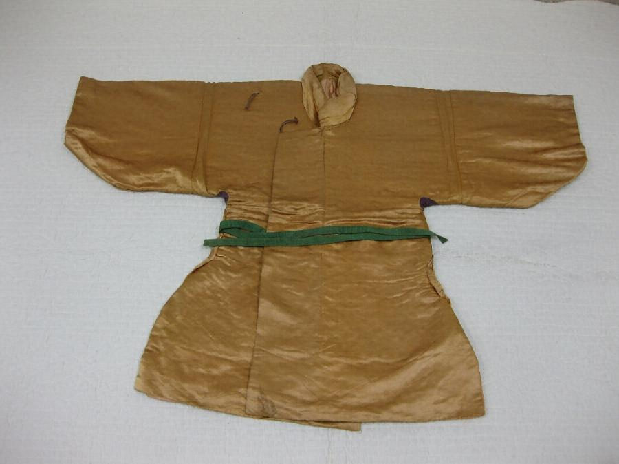 表地に金茶色の繻子、裏地に薄紅色の羽二重を用い、間に革製漆塗り亀甲形の板と鎖を縫い付けた白麻地を、真綿で挟んで挿入している。