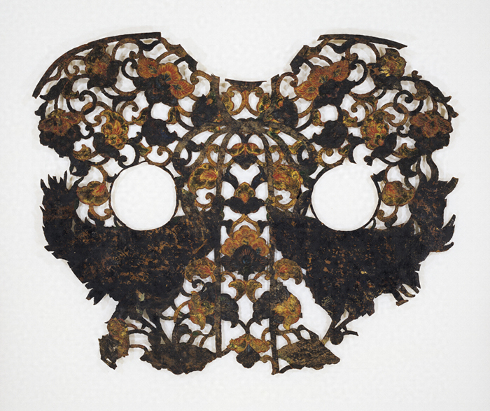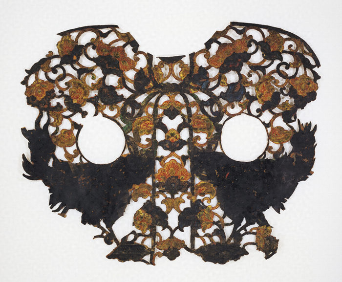 革製 牛皮材 彩色 金泥 截金 透彫 迦陵頻伽文