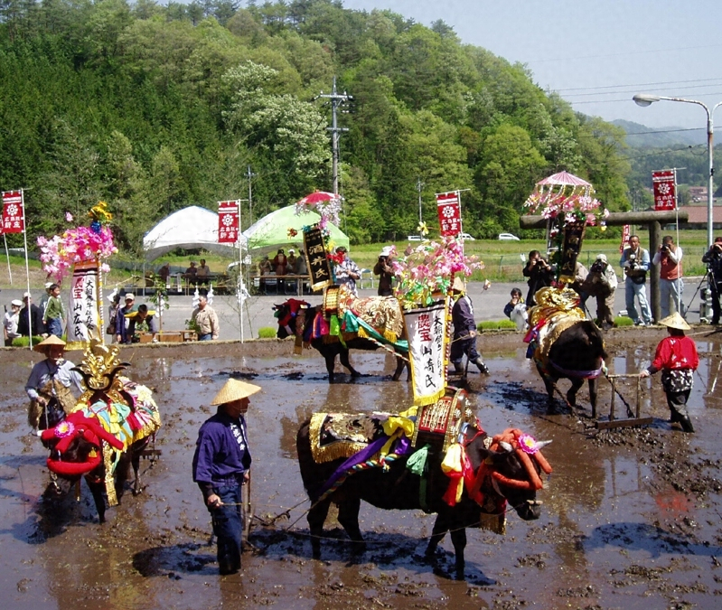 まず背に赤だすきも美々しく装飾をつけた牛が田に入って代掻きをし、次いでサンバイ(田植の音頭役で、サンバイ竹というササラのようなものを持つ。)、笛・太鼓・手打鐘・小鼓の囃子方、早乙女が行列組んで道中囃子を奏しながら田の中に入り、早乙女が一列に並んでサンバイと相対し、早乙女の後に囃子方が位置する。始めにサンバイが田の神迎えの祝詞を述べ、次いで早乙女が一せいに田植にかかる。その間、サンバイと早乙女が田植歌を問答風に掛け合わせてうたい、囃子方は太鼓を中心に楽を奏する。