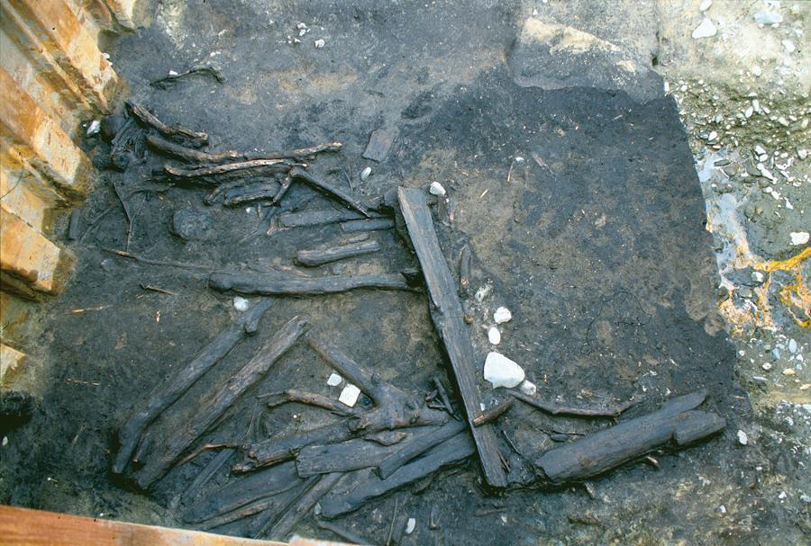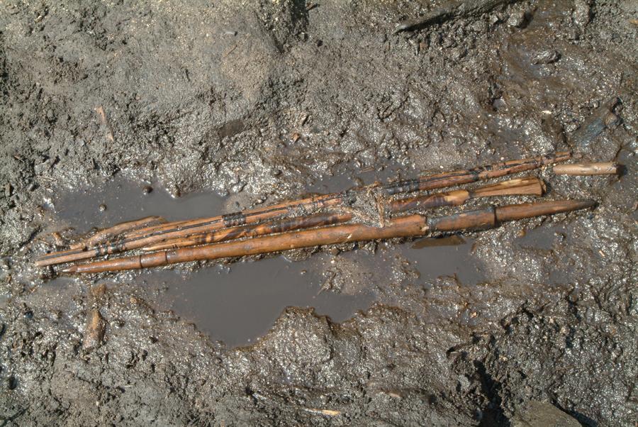中居遺跡は沖積地の接続する緩傾斜地の一帶に存するもので、大正9年以来発足され、地下約1.5メートルの箇所からクルミ・トチ・ナラなどの果核を主体とする特殊な泥炭層の存することが明かにされた。層中から木製腕輪・木製耳飾・木製容器・丹塗弓その他の木製品をはじめ、縄文式土器、石器、土偶、骨角器等が出土した。