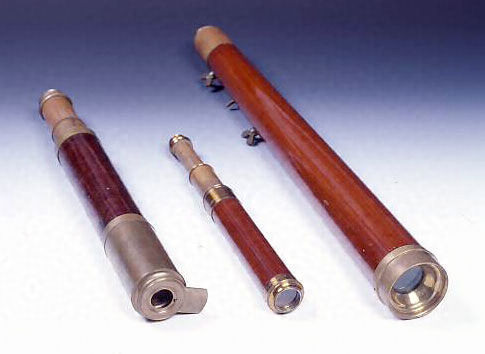 木製の特徴的な円錐形鏡筒の屈折望遠鏡は、航海望遠鏡(navigation telescope、marine telescope)と呼ばれるものである。揺れる船上で使いやすいようにシンプルなつくりであり、対物レンズと接眼レンズの間に正立レンズがはいっている、船舶や陸地の目標物に監視に用いられた航海の必需品であった。武雄鍋島家旧蔵品。