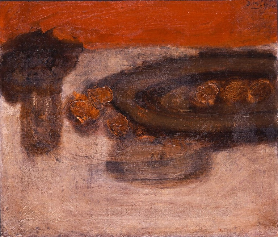 輝くように豊かな暖色系の色使いによりテーブル上の静物が描き出されている。当初「静物」「果物 花」と題されていたが、裏面の赤外線写真により、裏打ちにより隠れていた「果物籠」という表記が確認された。