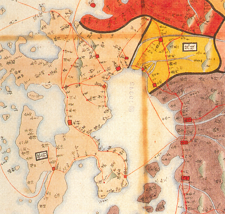 九州の簡略化された交通図で、海路もしめされている。凡例に国境をはじめ神社、仏閣、港、城下、名所旧跡をあげる。下部に藩主名、支配石高などが付記され、唐津の「水野左近将監」は忠鼎(藩主期間1775‐1805)のことで、文化年間頃の状況とみなされている。種子島には天文12年秋、南蛮商船によって鉄砲が伝来したことが付記されている。なにより国別に色分けされた色彩は鮮やかで、鑑賞するにも好ましい。朱線で道がしめされ、佐賀県内は東から田代・中原・佐賀と轟木と境原は省略されている。佐から西は有明海沿岸に引かれ、牛津・鹿島間の詳細は省略され、多良から諫早方面への道は示されていない。また佐賀の西にある「小野」は小田の誤りか。