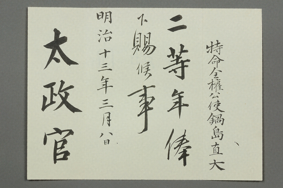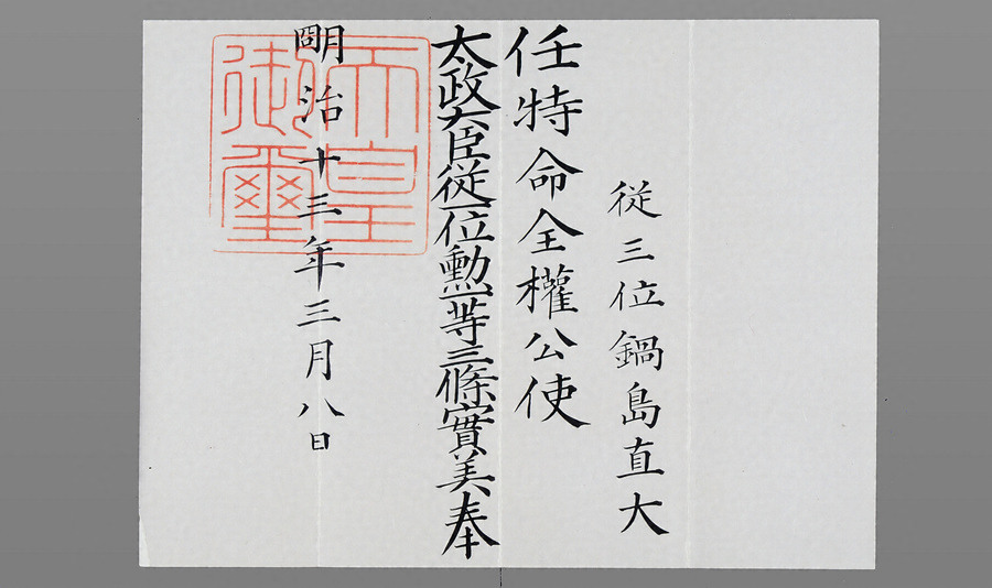 明治4年(1871)、岩倉使節団に同行した最後の藩主鍋島直大は大名華族留学生として英国オックスフォード大学に学び、明治7年佐賀の乱の報に接し一旦帰国、胤子夫人同伴で再渡欧し、明治11年帰国した。12年2月ドイツ、イタリアの皇族、アメリカ前大統領等の来航につき接伴掛を、8月には外務省御用掛を仰せつかる。そして、明治13年3月8日、特命全権公使に関する「任特命全権公使」「伊太利国在勤被仰付候事」「二等年俸下賜候事」という、三つの辞令書を太政官より同時に拝受した。セットで残る好例。