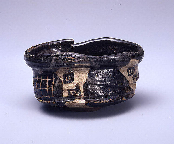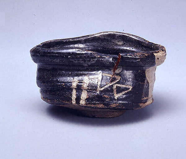 織部は、桃山時代の茶人古田織部に由来する名。斬新な造形と奇抜な意匠が特色の焼物である。この茶碗は、焼く時に生じた口の亀裂が見所で、この時代の独特の美意識が強く表れている。