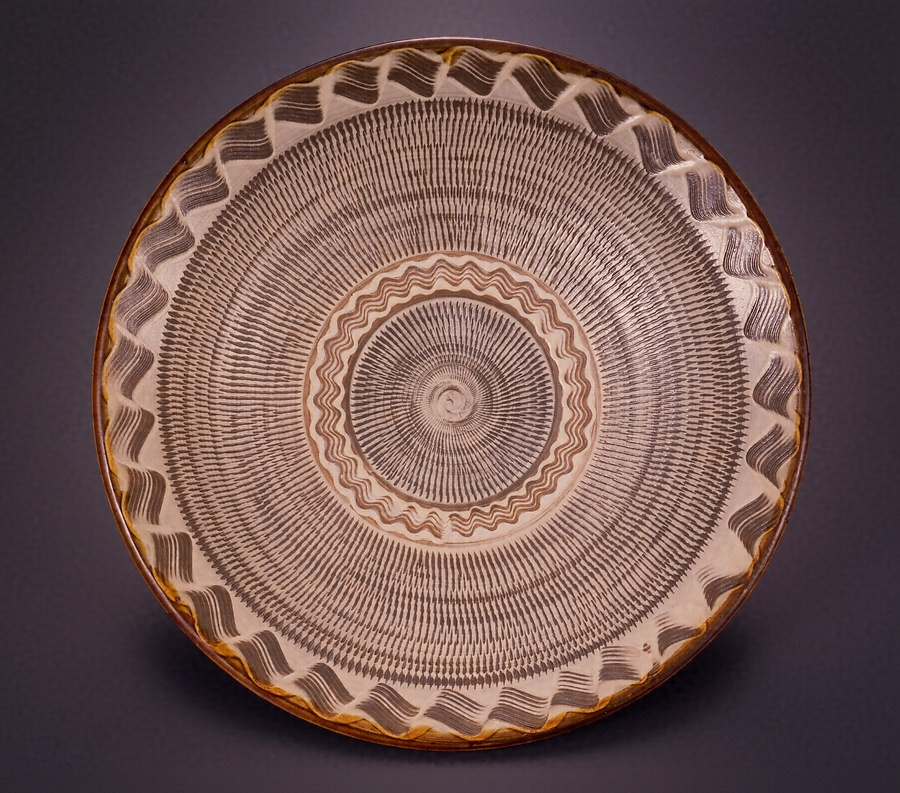 「飛鉋尺三寸皿」は、成形した素地に化粧土を施し、小鹿田焼で多用される装飾技法、飛鉋と櫛目の技法を駆使した一尺三寸皿である。