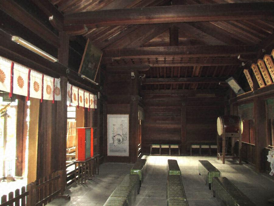 拝殿は桁行四間の入母屋造の正面に三間向拝を付け、北側に庇状の張出しと神饌所、背面に桁行二間の幣殿を設ける。土間式で基壇周囲に高欄を廻らせる。小屋を虹梁豕扠首、組物舟肘木として古風とし、伸びやかな曲線の蟇股を飾るなど設計者角南隆の特徴を示す。