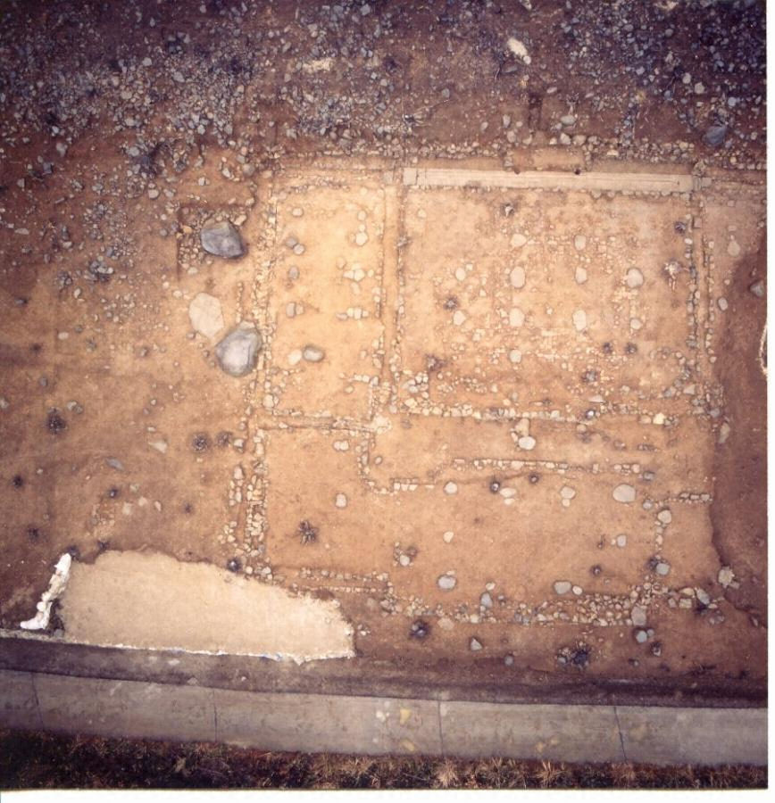 平坦面の西に隣接する一辺約52メートルの区画は、南辺と西辺に石塁がめぐり、東辺には平坦面から約1メートルの高さまで石垣を築いている。北辺部には礫が散在するのみで明確ではないが、石塁があったと考えられている。区画内には人頭大の礫を積み上げた一辺2.4メートル、推定高0.6メートルの塔が、東西・南北各10列で計100基、2.4メートル間隔で整然と配置される。ただし、現存するものは98基である。また、西辺部の石塁は南へ約30メートル、さらに東へ折れて約70メートル延びる。