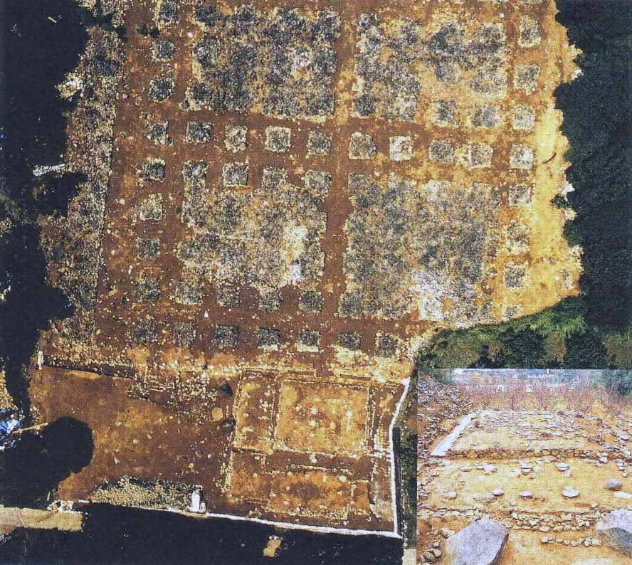 明らかとなった遺構には、中心建物群とその背後の斜面に配された石塔群がある。中心建物群は、斜面下辺部を造成した平坦面の中央に段状に築いた南北約22メートル、東西約18メートルの乱石積み基壇の上に配される。建物群は中央建物とその東・南・北面を取り囲む3棟の建物および東面建物と南面・北面建物を結ぶ回廊からなる。中央建物基壇が最も高く、それより北・南面建物基壇は0.35メートル、東面建物および回廊の基壇は約1メートル低い。中央建物は桁行3間、梁間3間の南北棟礎石建物で、中央の礎石1間四方分を除く基壇上面全体に〓(*1)を敷く。中央基壇西辺に沿う幅0.7メートル、長さ11.4メートルの範囲は、凝灰岩切石で舗装されている。南面建物は桁行5間、梁間1間の東西棟礎石建物、北面建物は削平のため全体が明らかではないが、南面建物と同じ規模・構造と推定される。東面建物は桁行3間、梁間2間の南北棟礎石建物である。