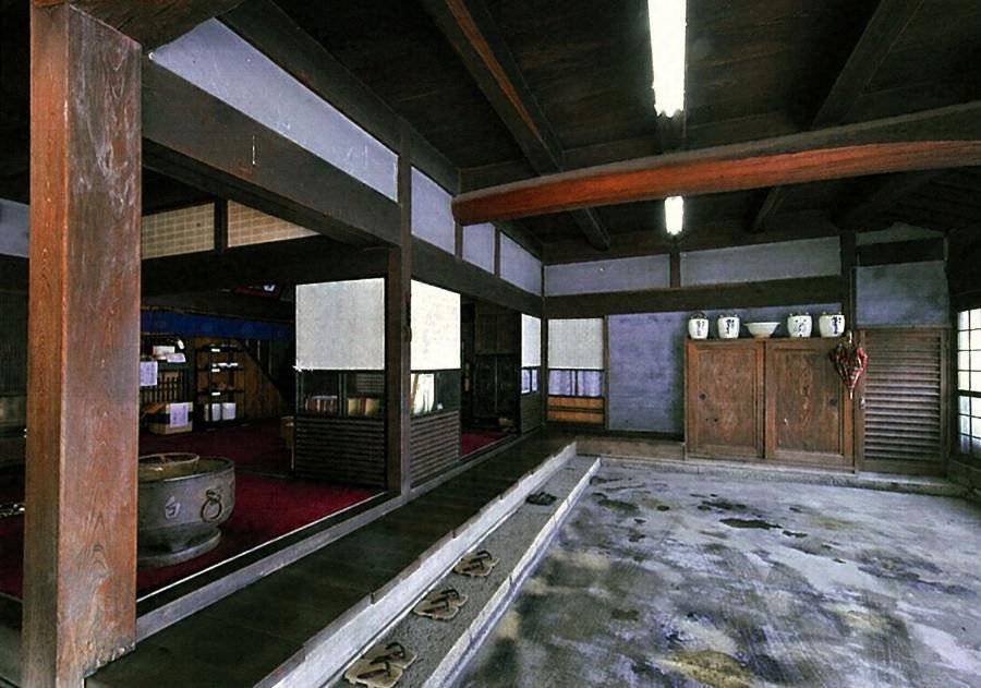 角地に東を正面して建ち、桁行一八メートル梁間一七メートル、木造二階建。入母屋造桟瓦葺で、両妻に小破風を重ねる複雑な屋根をつくる。一階は正面に出格子をたて、二階は出桁造の軒まで黒漆喰で塗り込め、虫籠窓を穿つ。重厚で、風格のある大型町家である。