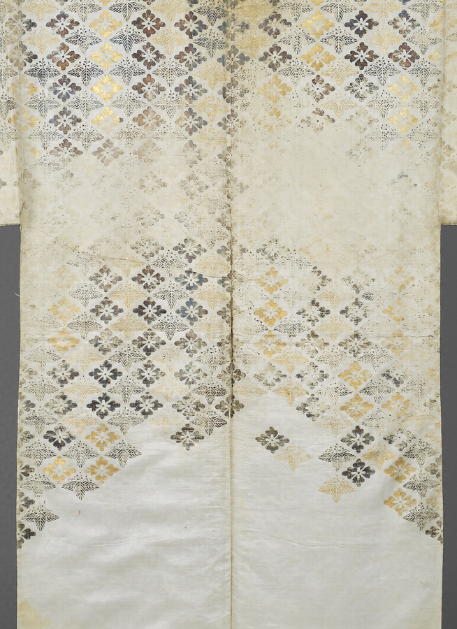 淡い水浅葱色の繻子地に花菱文と桐菱文を交互に繋ぎ、金・銀箔で摺り表し、裾近くは空けている。桐菱文はこの摺箔のために考案されたのであろう。五三桐紋を菱形に変形させ、中央の枝が右や左にたわんだ、特殊で手の込んだ意匠である。前襟の裏には「川嵜本家」と墨書のある木綿布片が縫い留められているが、土佐藩主山内家伝来品である可能性が最近になって浮上した。