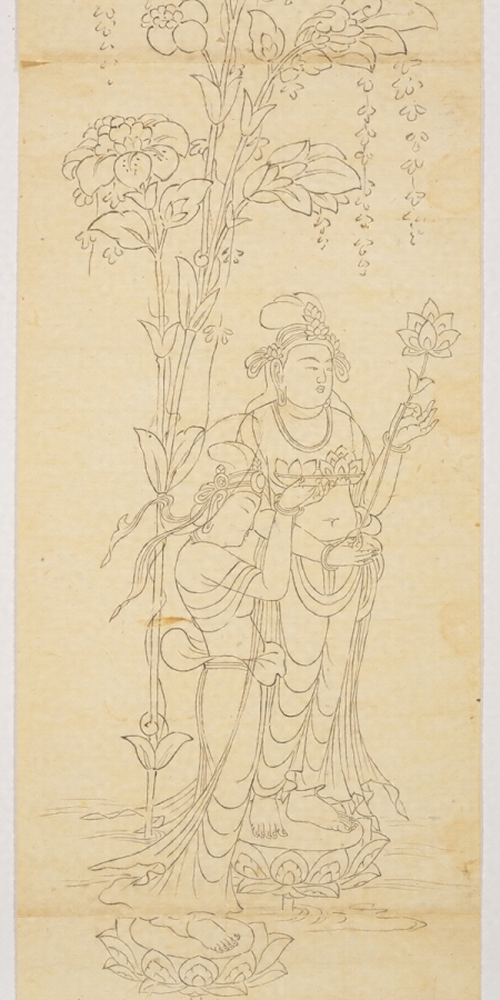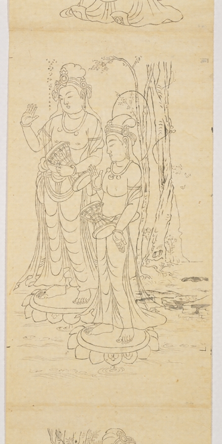 本図は『高山寺経蔵聖教内真言書目録』(建長3年=1251)所載の「東大寺戒壇院扉絵図一巻」に相当するとみられるもので、東大寺戒壇院に安置された華厳経厨子一基の扉絵を写したものと考えられる。同厨子は天平勝宝7歳(755)10月の戒壇院供養法会に合わせて造立されたとみられる。唐代絵画の影響を受けた天平盛期の仏教絵画の様を偲びうる数少ない作品として中国・日本絵画史上に貴重である。