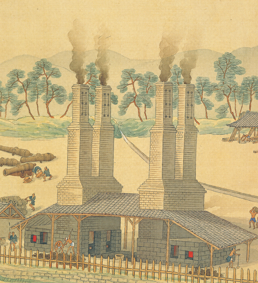 嘉永6年(1853)のペリー来航後、幕府は佐賀藩に鉄製砲50門を注文し、品川に台場を建設することとした。これを受けて佐賀藩では、先の築地反射炉に続き、嘉永6年9月多布施川沿いに新たに公儀石火矢鋳立所(製砲工場)を設けて鋳造にあたり、150ポンド砲2門を献上した。本図は昭和初年に描いた考証復元図で、2基(4炉)の反射炉が向かい合っている。