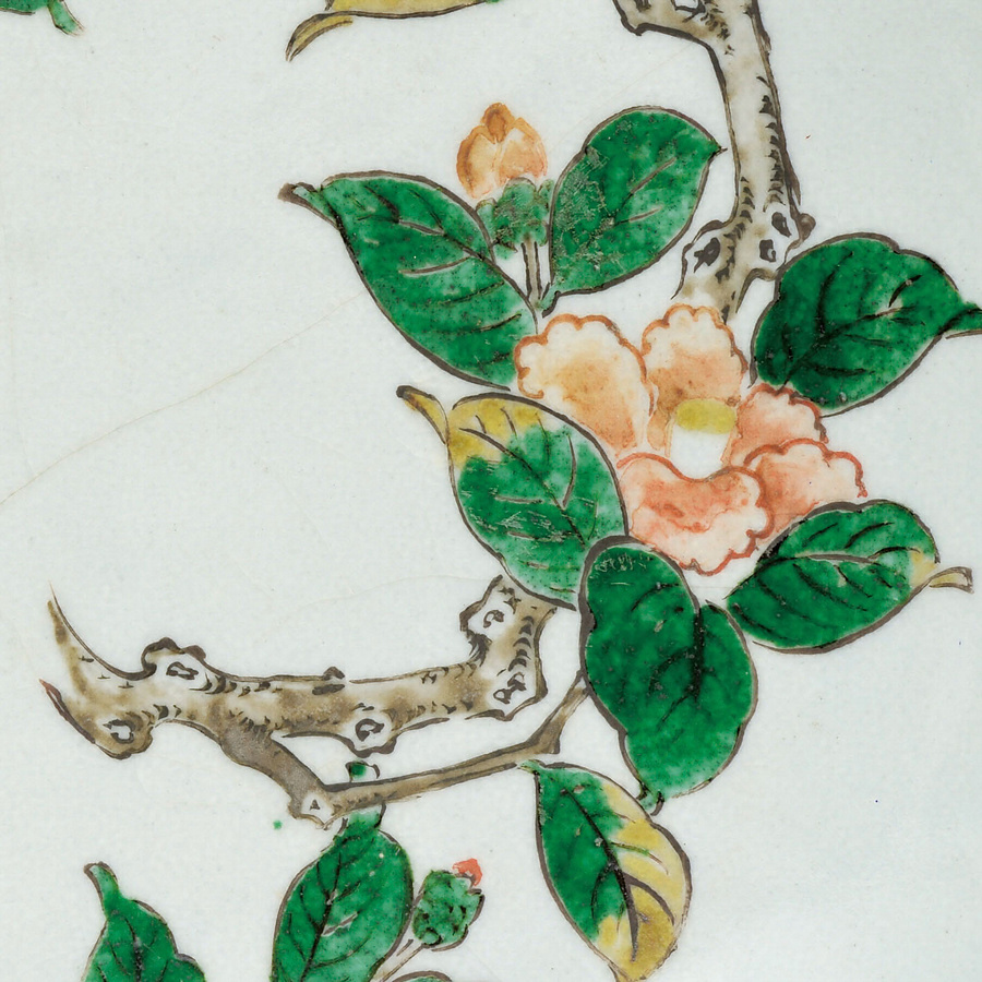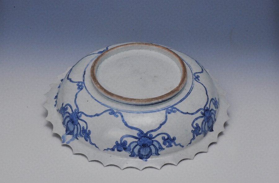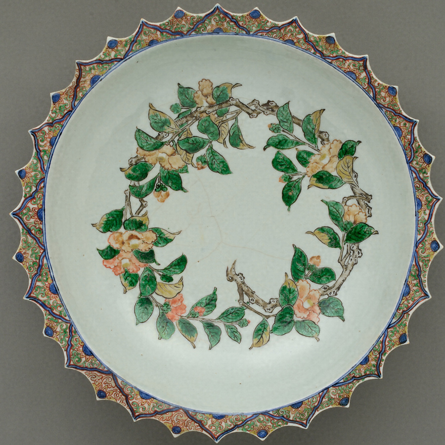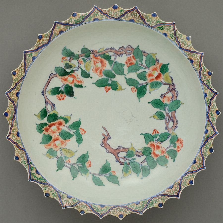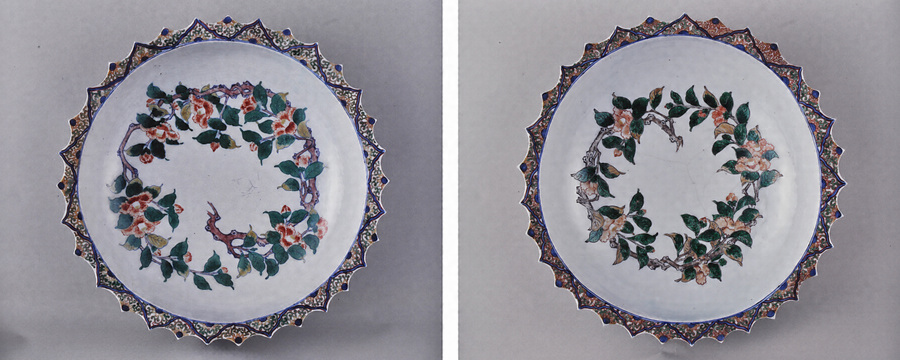 輪花形の口縁部に花唐草をあらわし、外側面に唐花唐草文を染付であらわす。見込みには椿文を輪をかくように描いているが、その輪郭線を一方は有田の初期色絵に特徴的な色絵のみで描き、もう一方は後の鍋島焼きの特徴である染付を用いて描いている。古九谷様式から初期鍋島様式への移行期の作例であり、初期鍋島の前身的な作品とされる。安政2年(1855)作成の「御寄附物帳」に「南京焼錦手大御鉢壱ツ損物 二」とあるのが本作で、2枚1対で伝来した。初代鍋島勝茂から菩提寺である高伝寺に寄附され、大正14年に鍋島家に返納された。