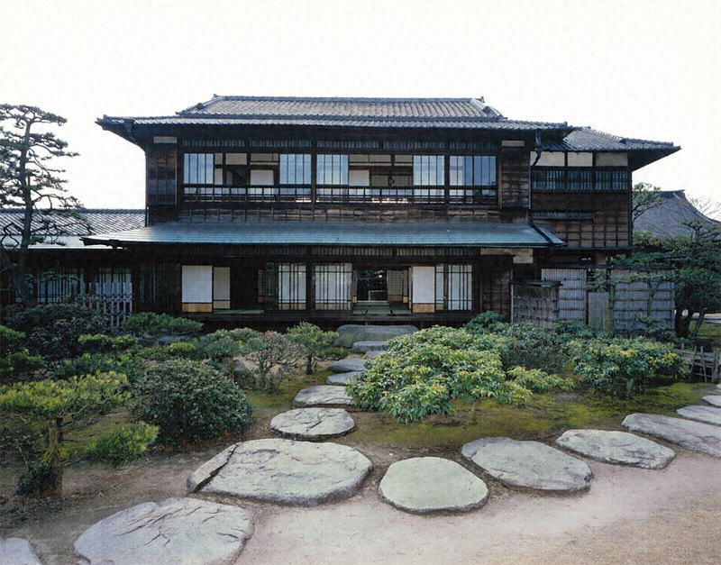 三の丸の南面に開く桜御門を正門として敷地の中央に本館を建て、海に面した北側に庭園をつくる。本館は、接客、居住、家政などの機能をもつ各部を廊下で接続する。江戸時代の御殿を意識した伝統的な配置や意匠をもち、百四十二畳敷の「大書院」から複数の小座敷を配した「杉の間」まで、充実した接客空間を擁する。