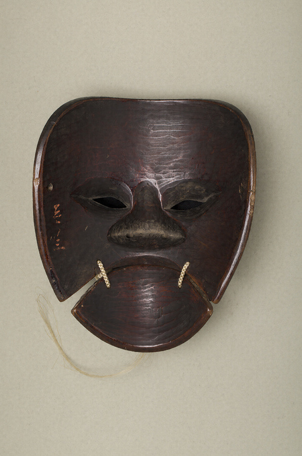 父尉は延命冠者の父という。父尉は室町中期に廃絶し、現在舞台で目にすることができるのは〈翁(式三番)〉を特殊演出「父尉延命冠者」で上演する時のみである。「白色尉」と似てはいるが、目尻が切れ上がり、肉がより引き締まってみえるなどの相違がある。額のボウボウ眉には、動物の毛皮を丸く切って貼る。面裏は刀目を整えて仕上げられて拭漆が施され、「壱ノ三」の朱書きがある。面当てに「父尉翁 赤鶴作 一之三」との墨書がある。NM38からNM42の5面は一揃えで伝来し、NM38からNM40は面袋が共通する。