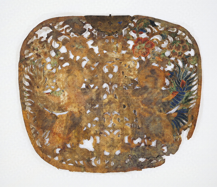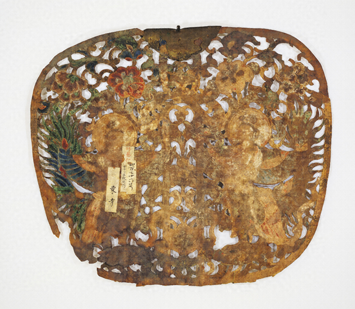 革製 牛皮材 彩色 金泥 截金 透彫 迦陵頻伽文