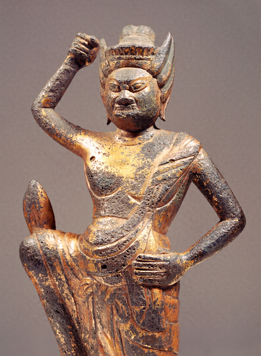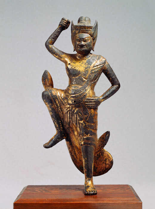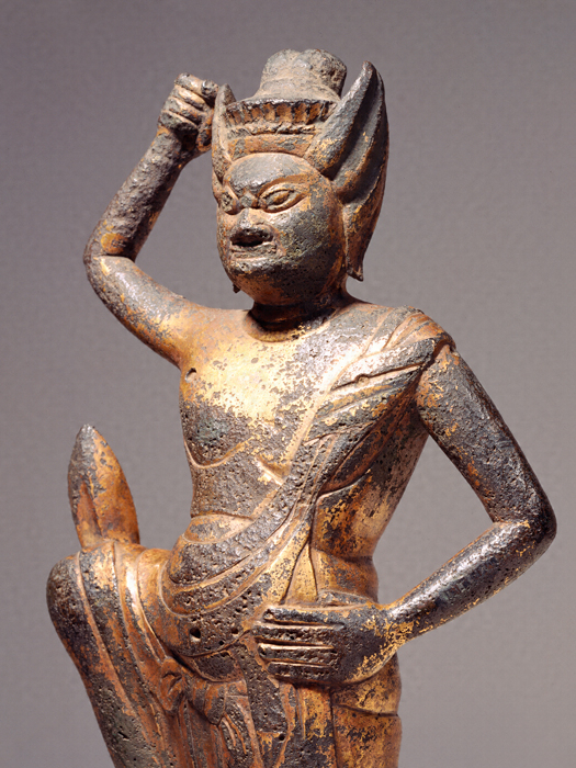 眼を見ひらき、髪を逆立てて忿怒(ふんぬ)の相を表し、左足は岩を踏み、右足は大きく跳ね上げる姿。修験道(しゅげんどう)の祖とされる役行者(えんのぎょうじゃ)が大峯山において感得したという蔵王権現(ざおうごんげん)が、盤石(ばんじゃく)の巌(いわお)の中から出現した様を表すもの。その作例は平安時代前期から現れるが、隆盛期は平安時代後期であり、本像もいかにも王朝風の整斉美を感じさせる造形である。蔵王権現像には木彫(もくちょう)もあるが、山岳寺院の過酷な安置条件を考慮してか、銅造のものが多く、まれに鉄製の作品もある。