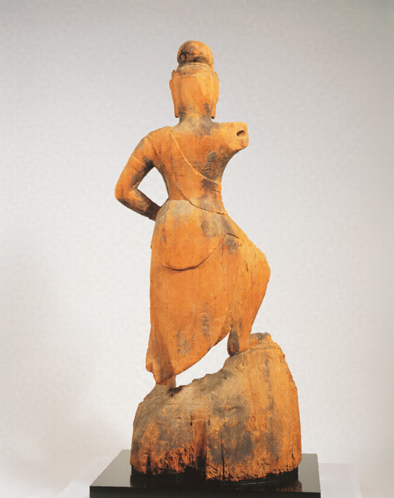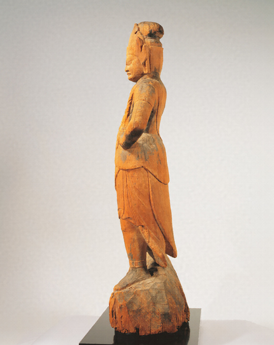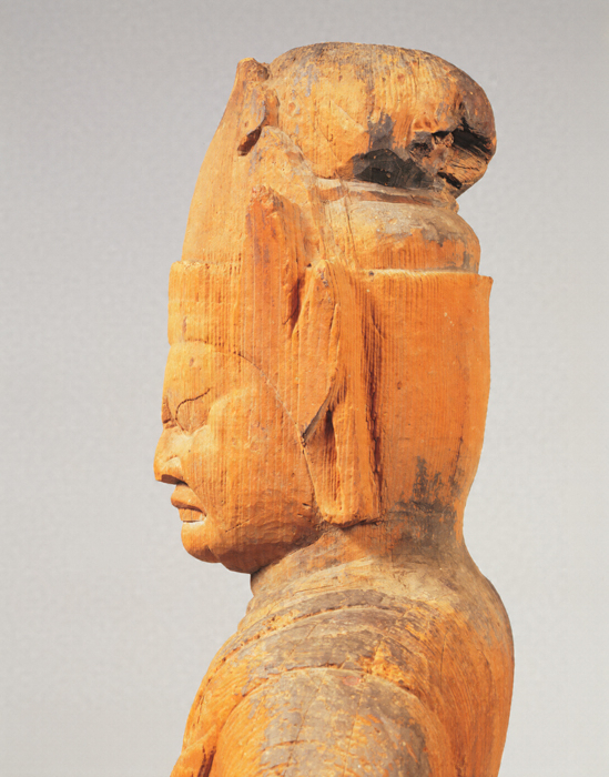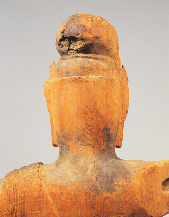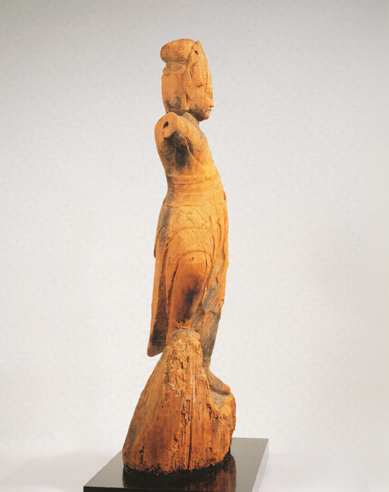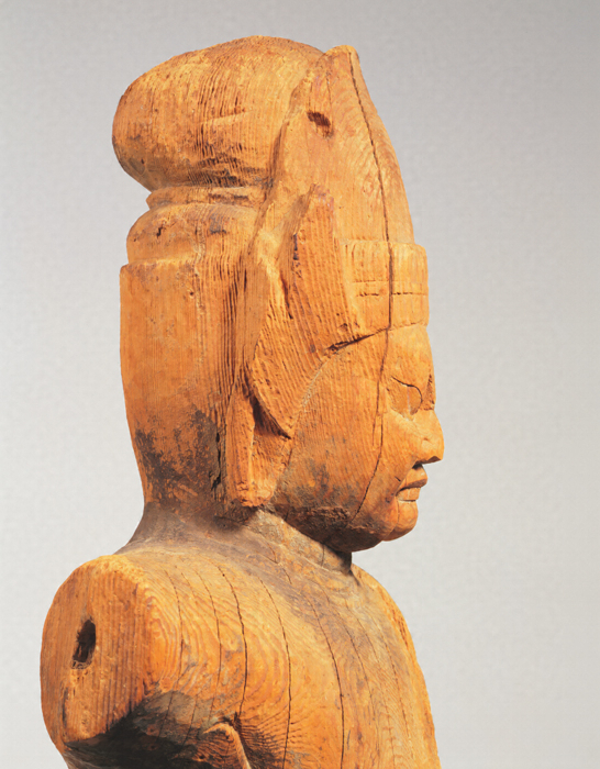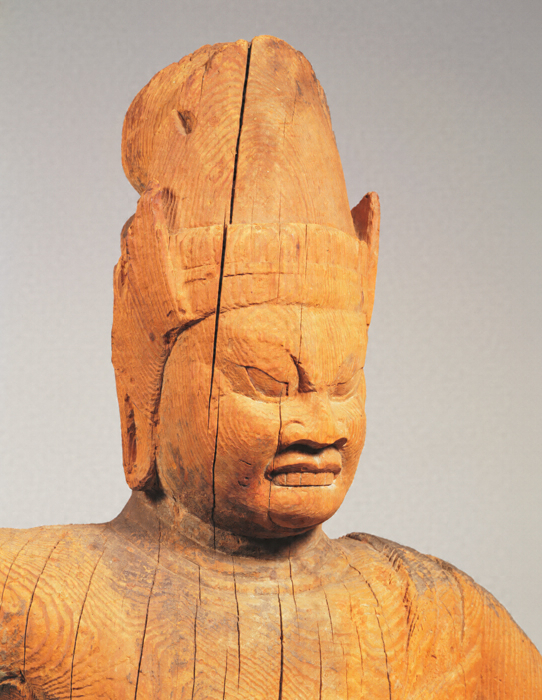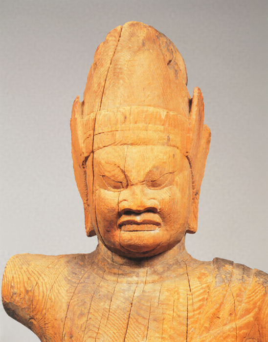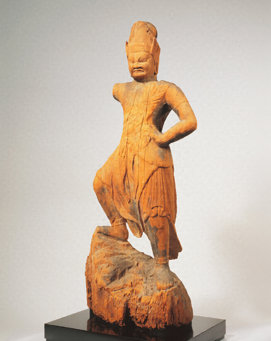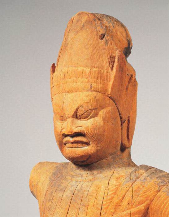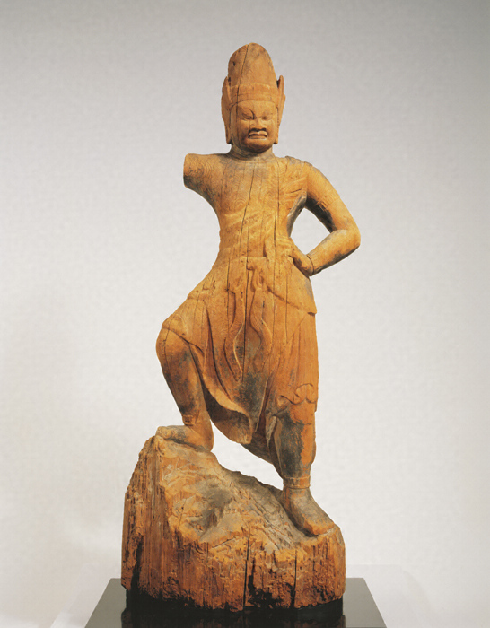 神仏習合思潮のなかで誕生した日本独自の尊格である蔵王権現(ざおうごんげん)の彫像。修験道(しゅげんどう)の祖とされる役行者(えんのぎょうじゃ)が感得したと伝承されるが、文献上では、京都・醍醐寺(だいごじ)の開山である聖宝(しょうぼう)(832-909)が金峯山(きんぷせん)において造立した三軀(く)の像のなかに「金剛蔵王菩薩」が含まれているのが注意され、史実としてはこの頃に成立を求めるのが穏当だろう。本像は岩座まで同材から彫り出す一木彫像(いちぼくちょうぞう)。忿怒(ふんぬ)の相のなかにも平安後期風の典雅さが感じられる。失われた右腕は上方に振り上げ、金剛杵(こんごうしょ)を握っていたものか。